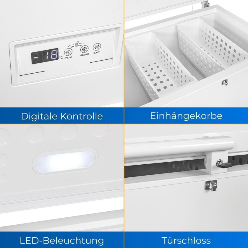 Mit einem Jahresstromverbrauch von nur 188 kWh ist die Gefriertruhe besonders sparsam im Betrieb. Die integrierte Innenbeleuchtung und die zwei Vorratskörbe ermöglichen eine übersichtliche Lagerung und schnellen Zugriff auf Ihre Tiefkühlkost.