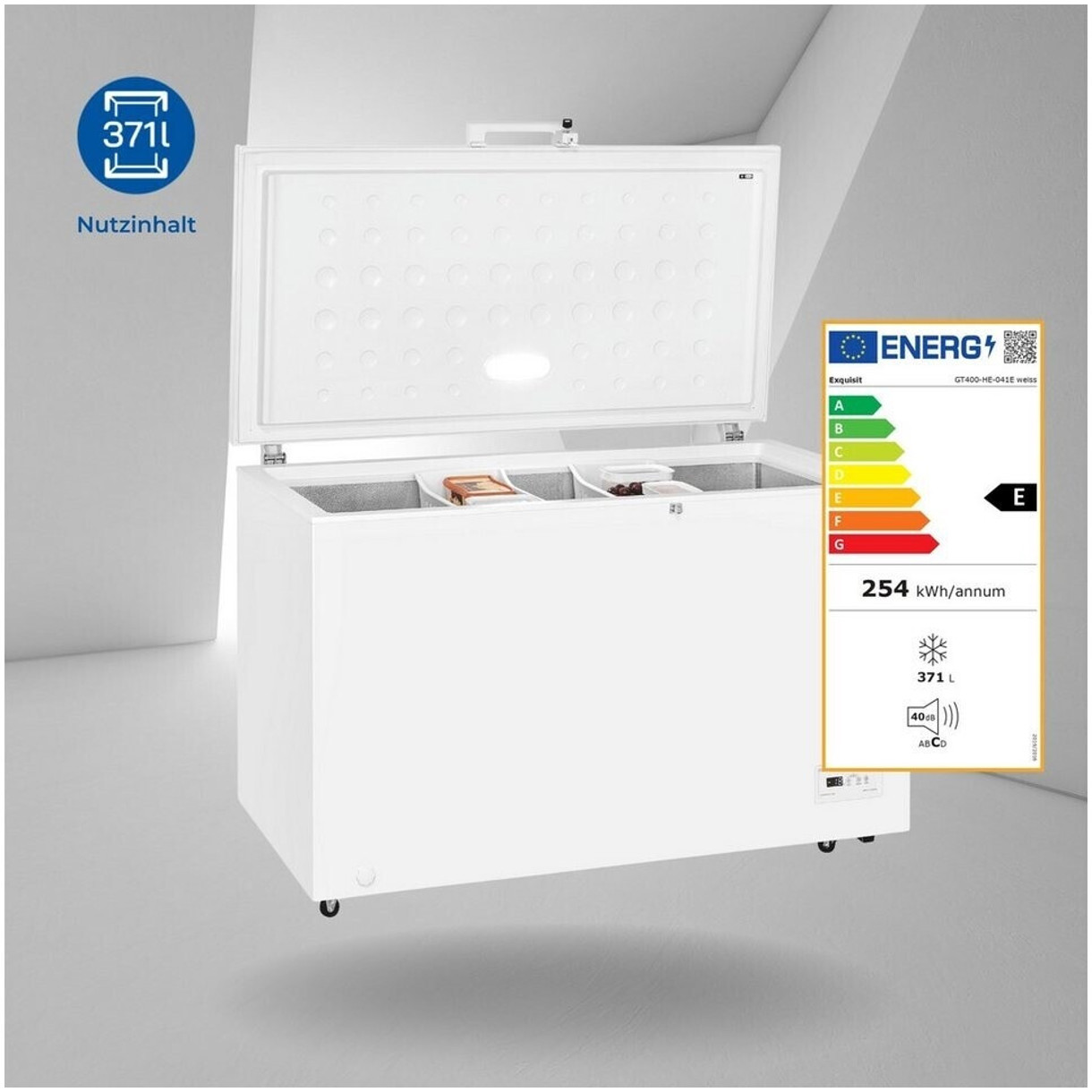 Die Exquisit GT400-HE-040E Gefriertruhe bietet mit 371 Litern Nutzinhalt viel Platz für Ihre Tiefkühlwaren und ist dank der SN- und N-Klimaklassen optimal für Umgebungstemperaturen von +10°C bis +32°C geeignet. Mit einem Gefriervermögen von 18 kg in 24 Stunden und einer Lagerzeit von 36 Stunden bei Störung bleiben Ihre Lebensmittel stets sicher gefroren.