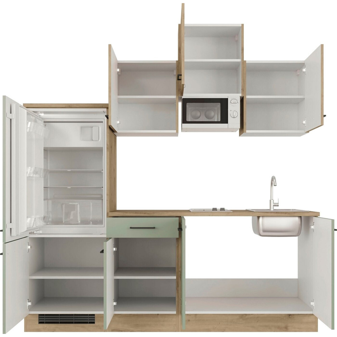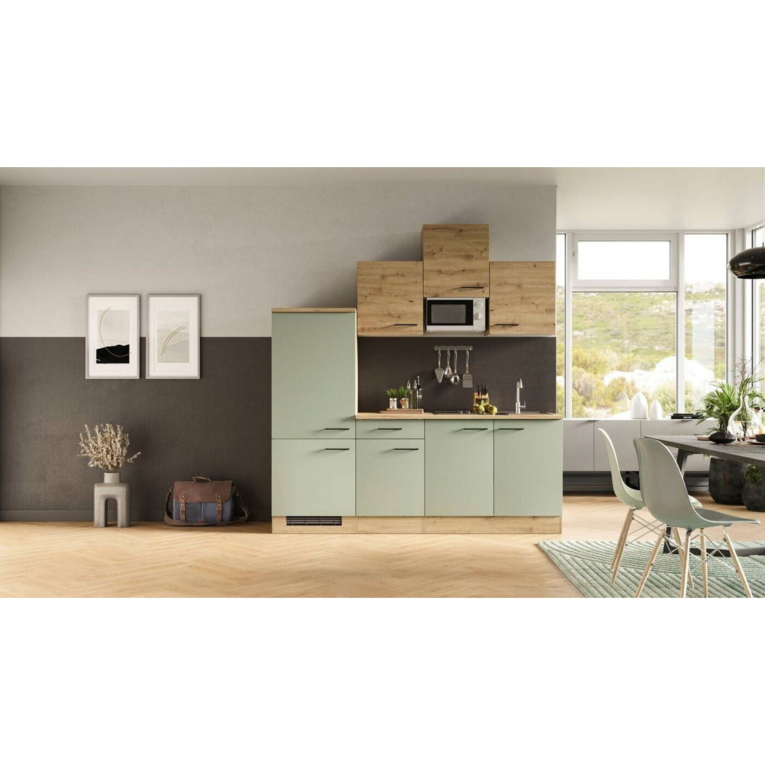 Die Flex-Well Küchenzeile Cara in grün eiche matt ist eine praktische Miniküche mit einer Breite von 210 cm. Sie ist reversibel montierbar und bietet eine ideale Lösung für kleine Wohnräume oder Apartments.