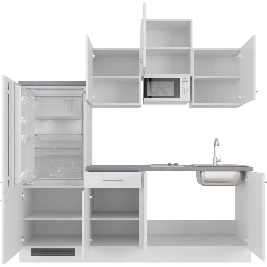 Die Flex-Well Küchenzeile Varo ist eine moderne Miniküche, die trotz ihrer kompakten Maße eine umfassende Ausstattung bietet. Mit einer Breite von 210 cm passt sie perfekt in kleinere Wohnräume oder Büros und ist dabei reversibel aufbaubar, um sich optimal an Ihre Raumgegebenheiten anzupassen.