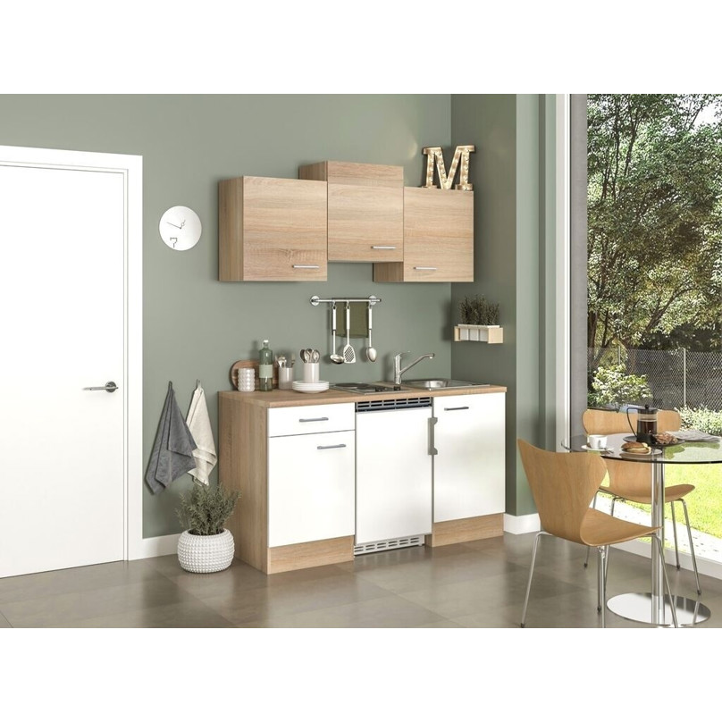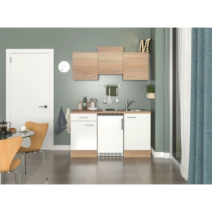 Die Flex-Well Singleküche Samoa 150 cm ist eine praktische Miniküche mit Elektrogerät, die perfekt in kleine Räume passt. Ausgestattet mit einem Kühlschrank und Kochfeldern bietet sie alles, was man zum Kochen und Kühlen benötigt. Das Design in Sonoma Eiche Dekor verleiht Ihrer Küche eine moderne und ansprechende Optik.