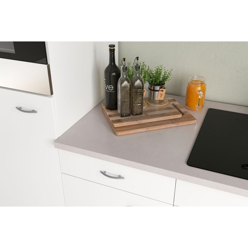 Die Flex-Well Küchenzeile Wito in weiß matt bietet eine effiziente und stilvolle Lösung für kleine Küchen. Ausgestattet mit praktischer Mikrowelle und einer Restwärmeanzeige am Kochfeld, vereint sie Funktionalität und modernes Design.