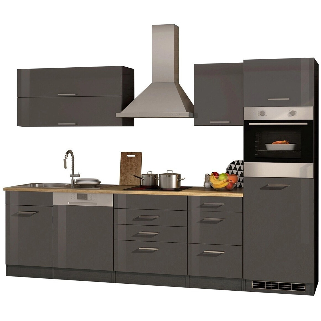 Die Held Möbel Küchenzeile Mailand ist eine moderne Miniküche mit einer Breite von 300 cm und einer Höhe von 200 cm, ideal für kleine Räume und Apartments. Sie überzeugt mit ihrer Hochglanz-Grau Optik und bietet eine umfassende Ausstattung für den täglichen Bedarf.