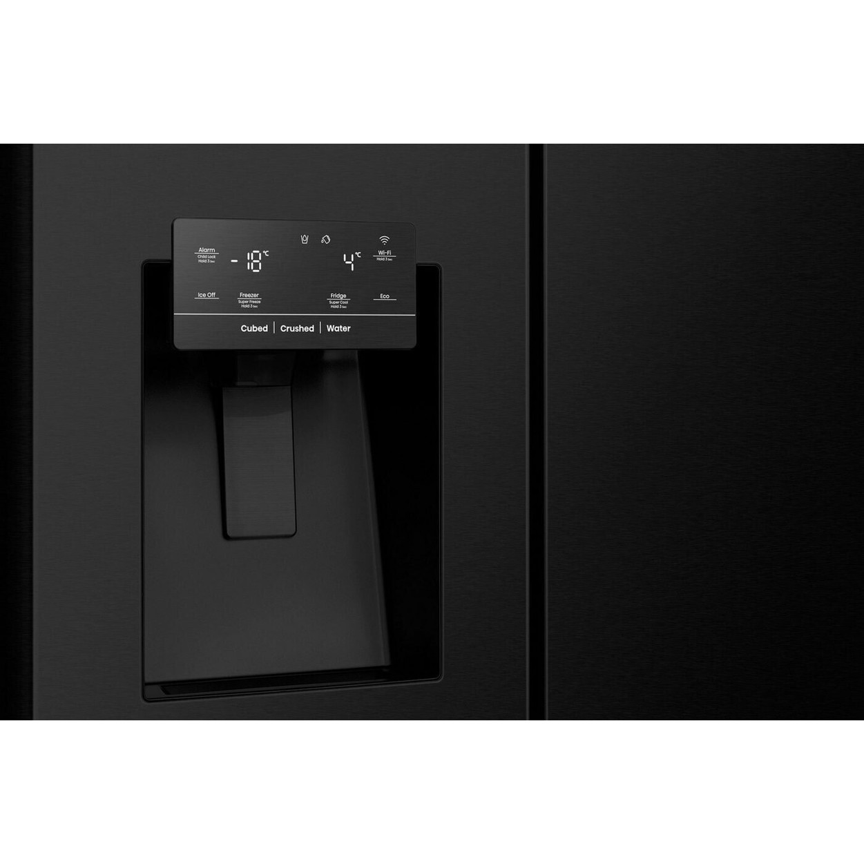 Ein integrierter Wasserspender und Eiswürfelspender sorgen für Komfort und kühle Getränke, während das LED-Display eine einfache Bedienung ermöglicht.