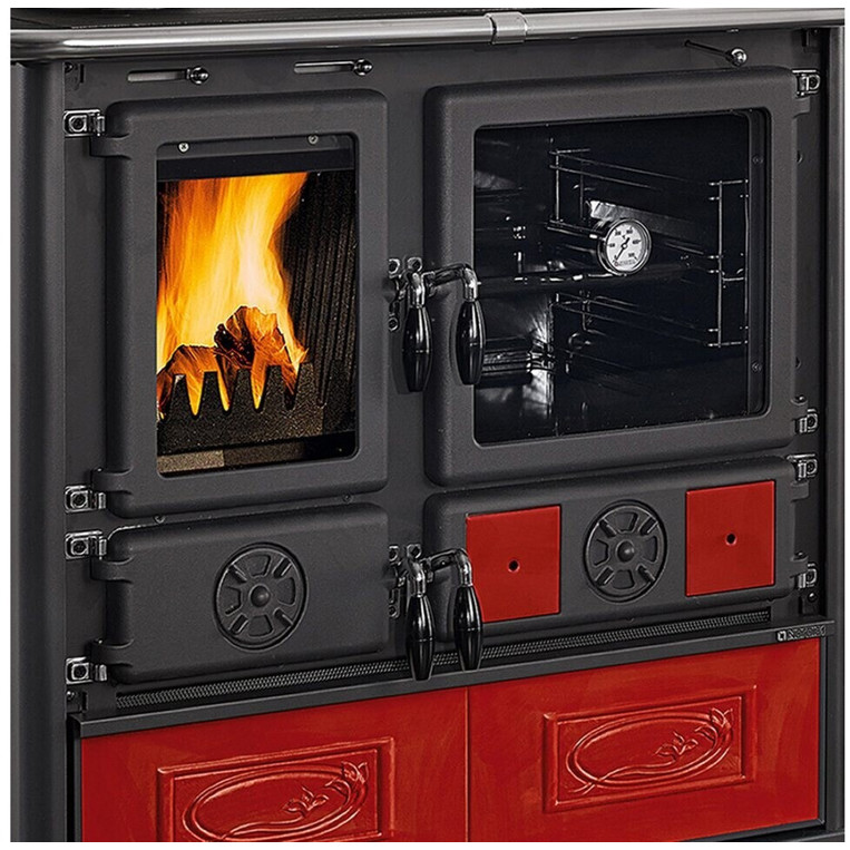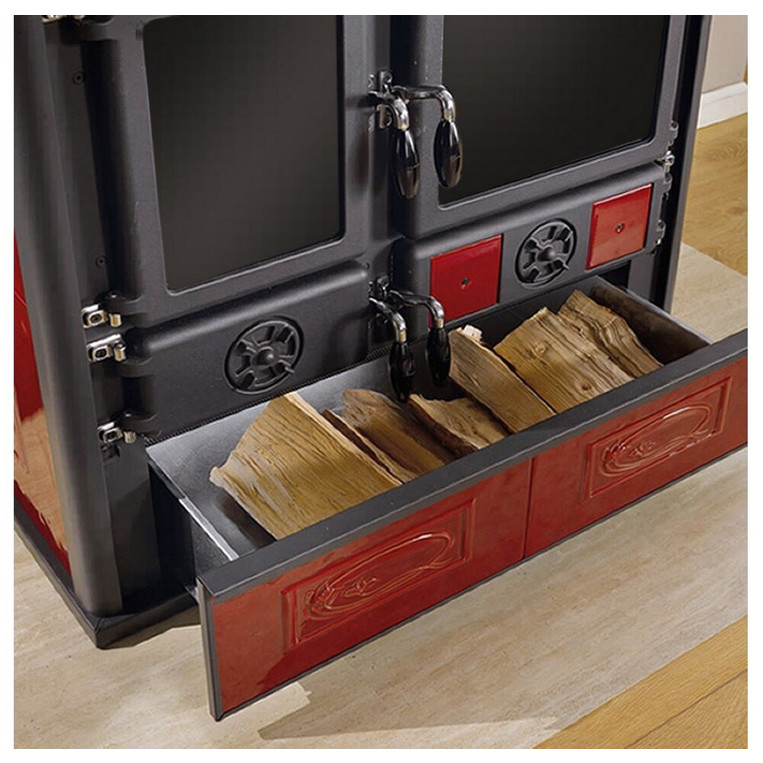 Dieser Holzherd überzeugt durch sein robustes Gusseisen-Design in Bordeaux-Rot und Schwarz, kombiniert mit praktischen Ausstattungsmerkmalen wie einem Thermometer. Die Anschlussmöglichkeiten hinten und oben bieten flexible Installationsoptionen in Ihrer Küche.