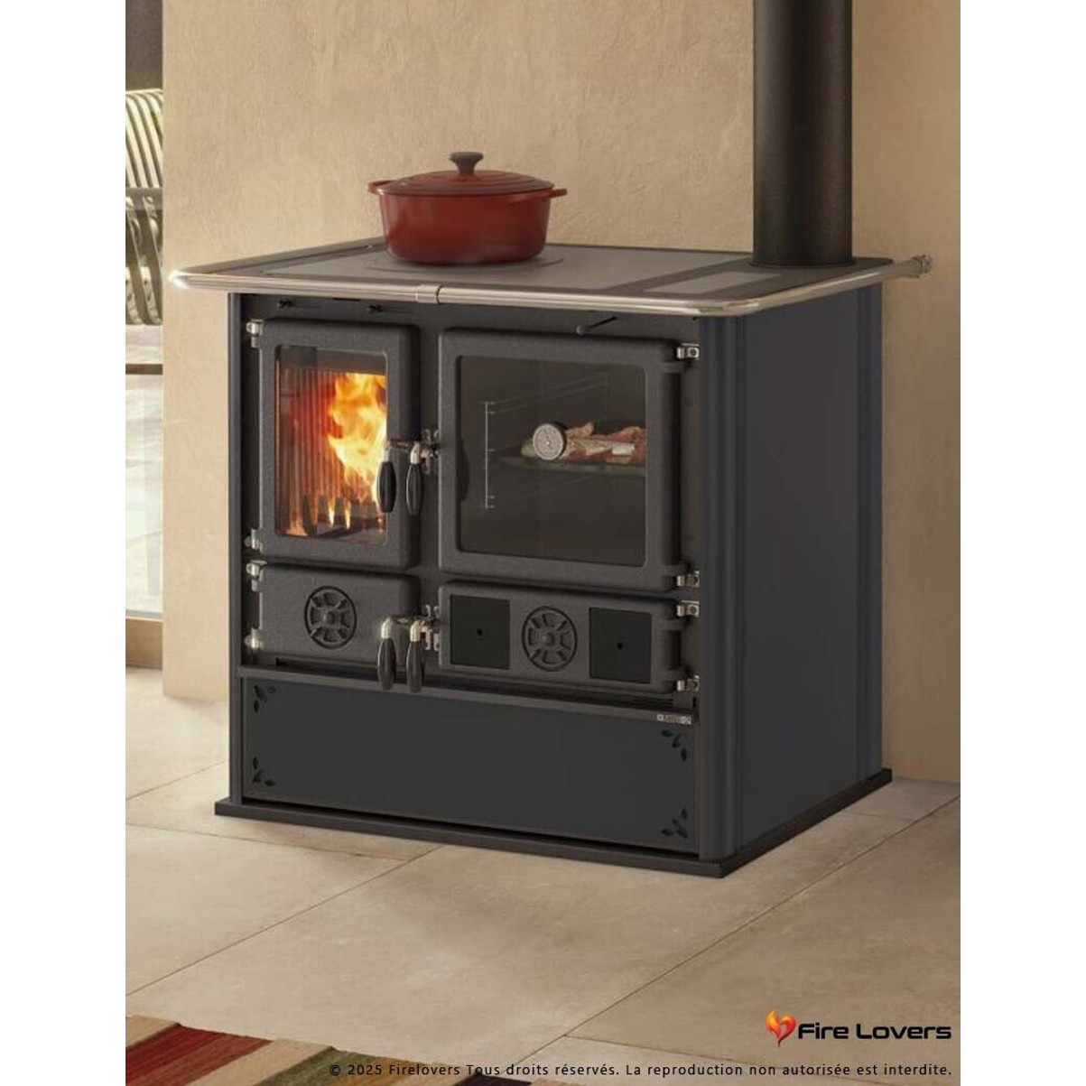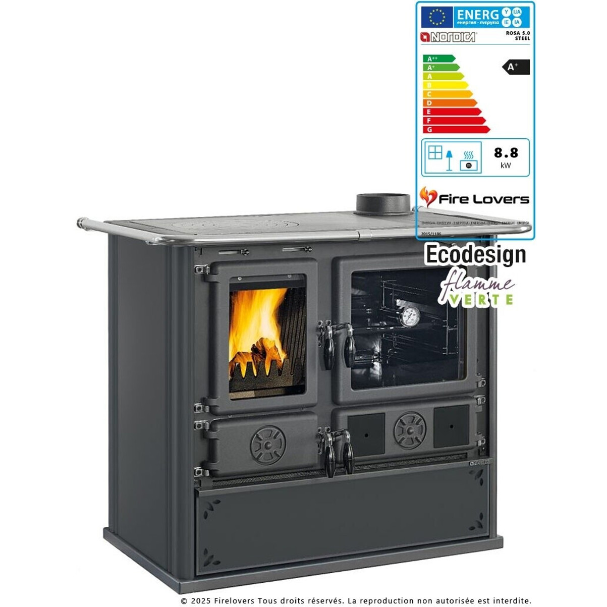 Der La Nordica Rosa 5.0 Holzherd in Schwarz ist ein Festbrennstoffherd mit einer Heizleistung von 8,8 kW, ideal für die Beheizung von Räumen bis zu 105 m².