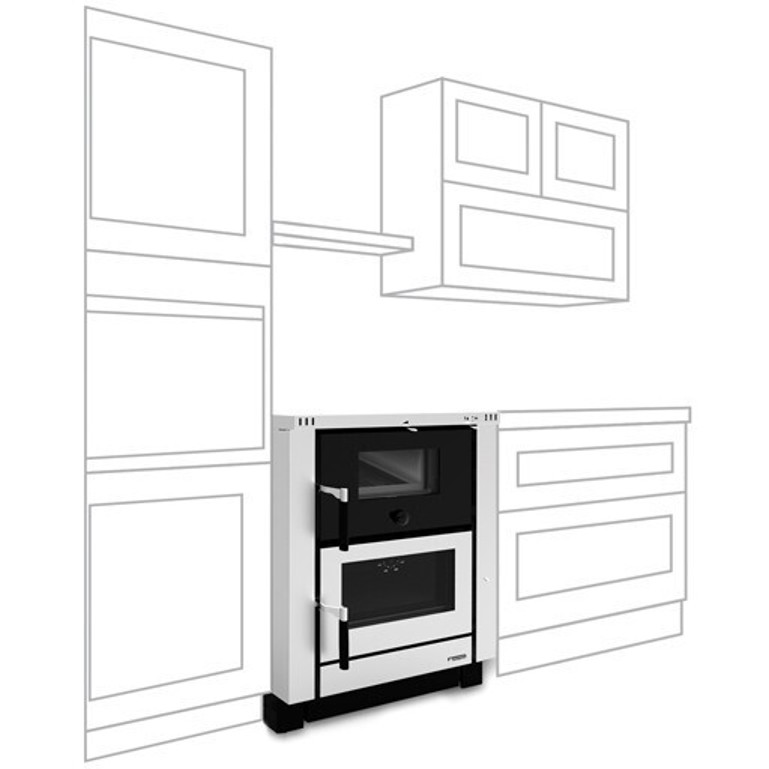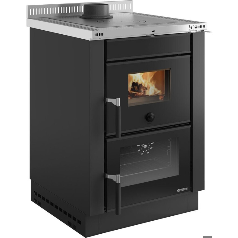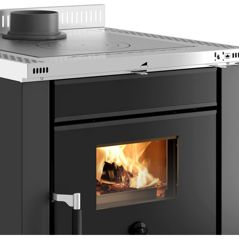 Ausgestattet mit einem Backofen, Scheibenspülung und Sichtfenster, ermöglicht dieser Dauerbrandherd nicht nur effizientes Heizen, sondern auch komfortables Kochen und Backen. Das integrierte Thermometer unterstützt präzises Zubereiten.