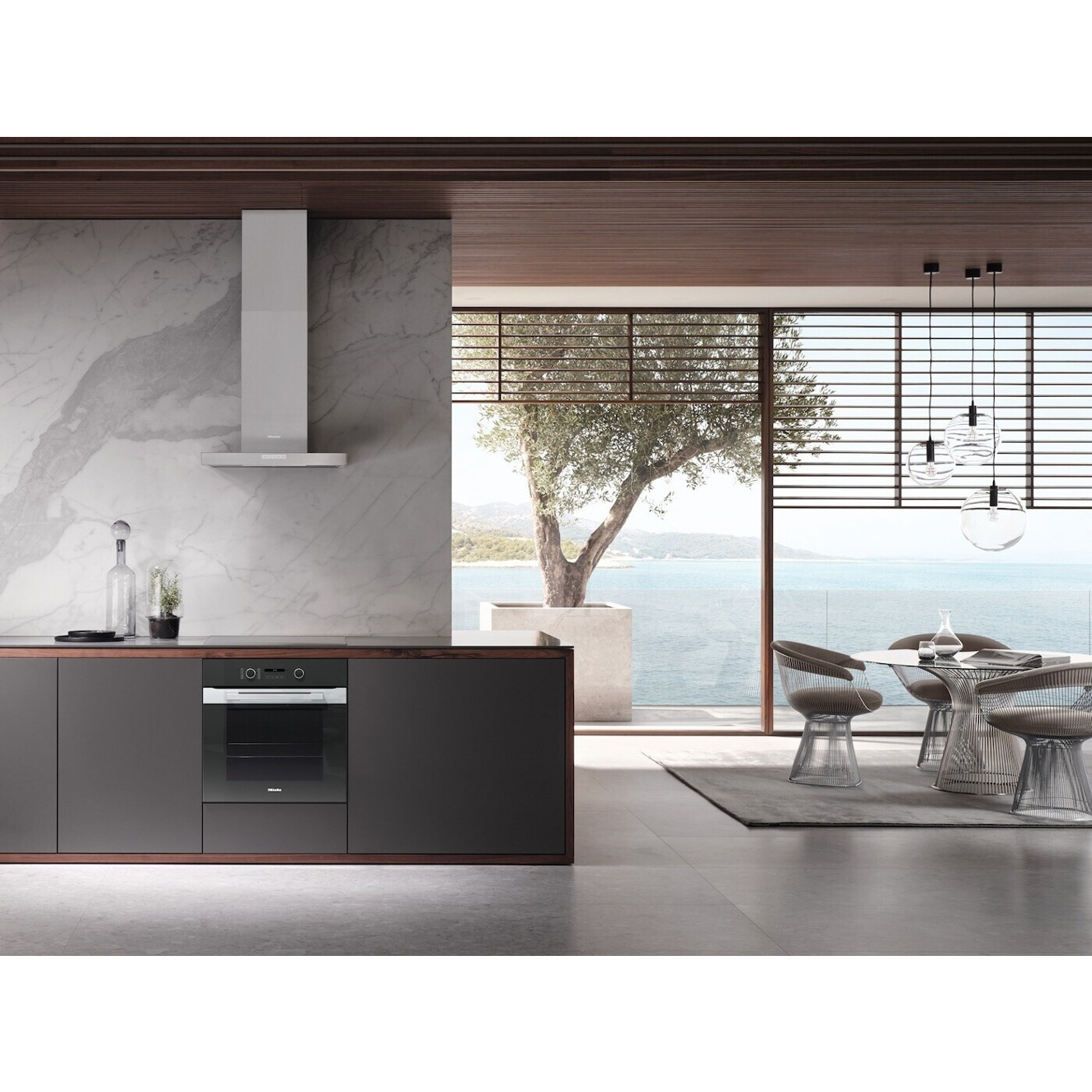 Die Miele DAW1620 Wandhaube aus Edelstahl bietet eine effiziente Lösung für saubere Luft in Ihrer Küche. Mit Beleuchtungsstärke von 390 lux und warmweißer LED-Beleuchtung sorgt sie für optimale Sicht beim Kochen.