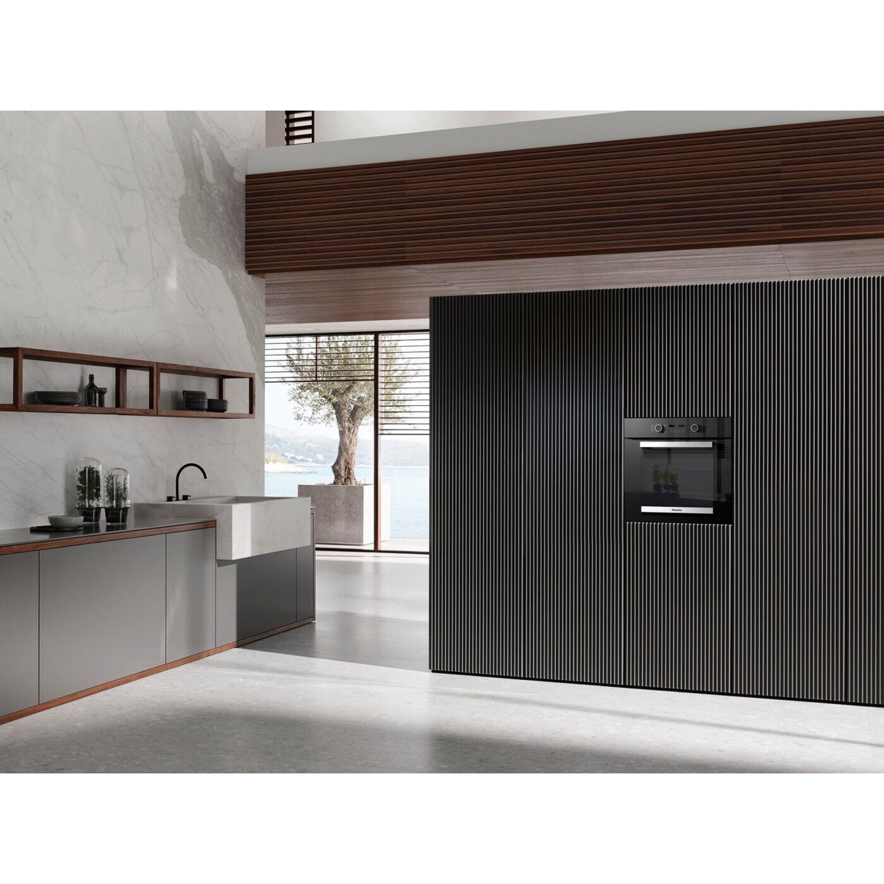 Der Miele H 2465 B Active EL Einbaubackofen in elegantem Schwarz vereint ein großzügiges 76 Liter Innenraum-Volumen mit vielseitigen Beheizungsarten wie Heißluft, Ober-/Unterhitze und Grill. Ausgestattet mit praktischen Funktionen wie Schnellaufheizung und Automatikprogrammen, bietet er eine präzise Temperaturregelung von 30 bis 300 °C.