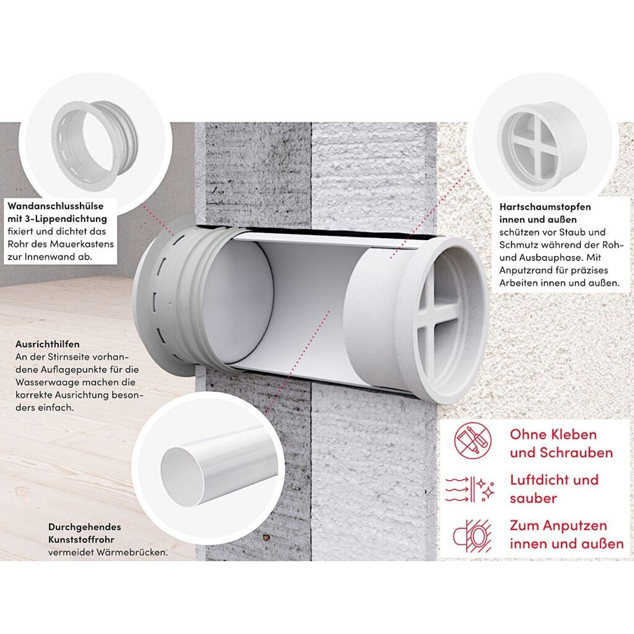 Dieser Mauerkasten ist speziell für Rundrohre konzipiert und kann bei Bedarf einfach gekürzt werden, um eine optimale Passform zu gewährleisten. Im Lieferumfang sind sowohl der Mauerkasten als auch ein passender Adapter enthalten.