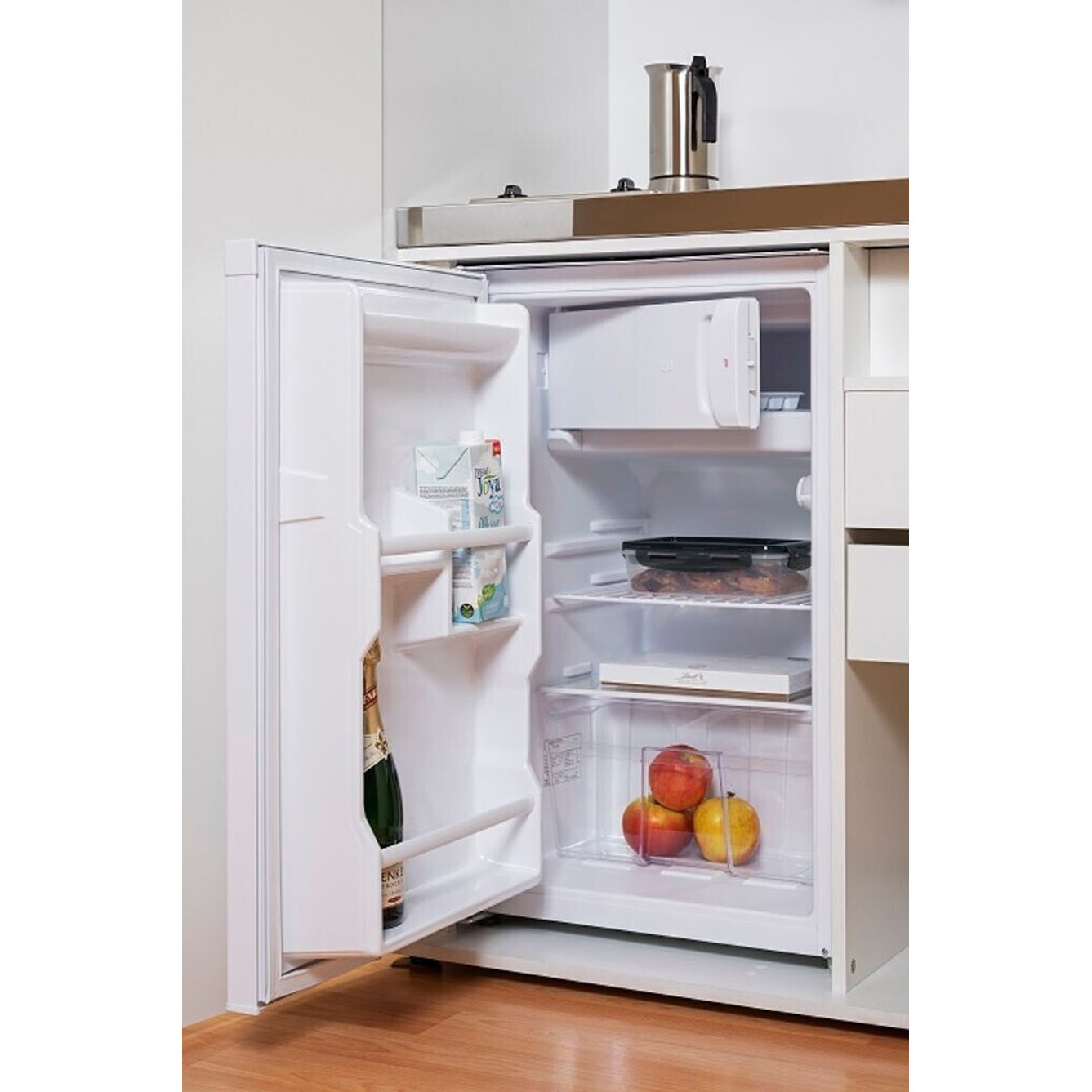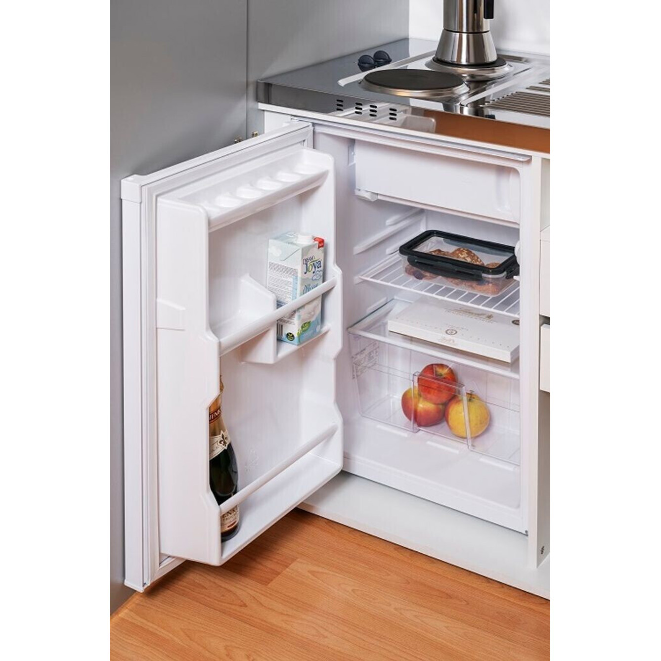Das Kochfeld hat einen Gesamtanschlusswert von 3,0 kW mit Platten von 145 mm und 180 mm. Die Mikrowelle verfügt über 17 Liter Garraum, 700 W Leistung und nützliche Auftau-/Garprogramme. Im Kühlschrank finden 73 Liter Kühlgut und 8 Liter Gefriergut Platz.