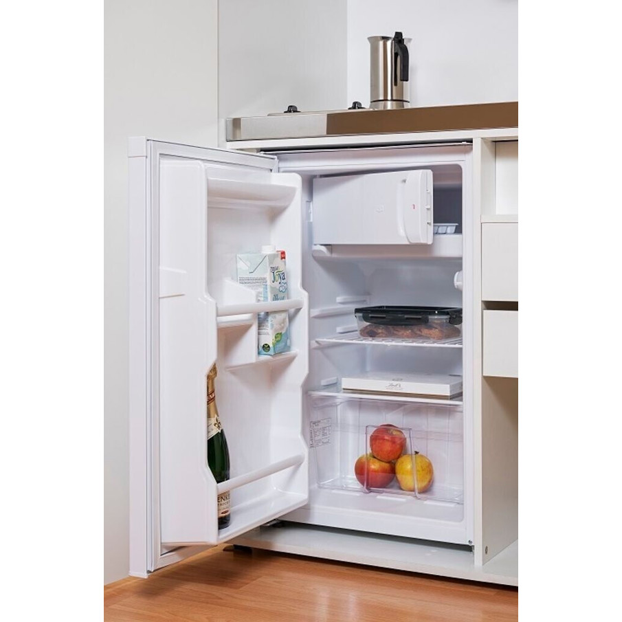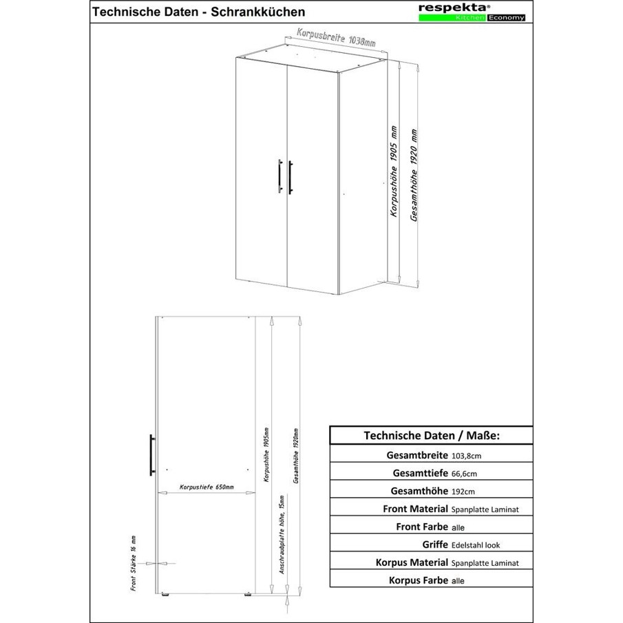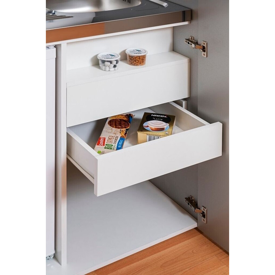 Mit einer Breite von 104 cm, einer Höhe von 192 cm und einer Tiefe von 67 cm bietet diese Miniküche trotz ihrer kompakten Maße ausreichend Stau- und Arbeitsfläche. Der geräuscharme Betrieb von 41 dB(A) sorgt für eine angenehme Nutzung.