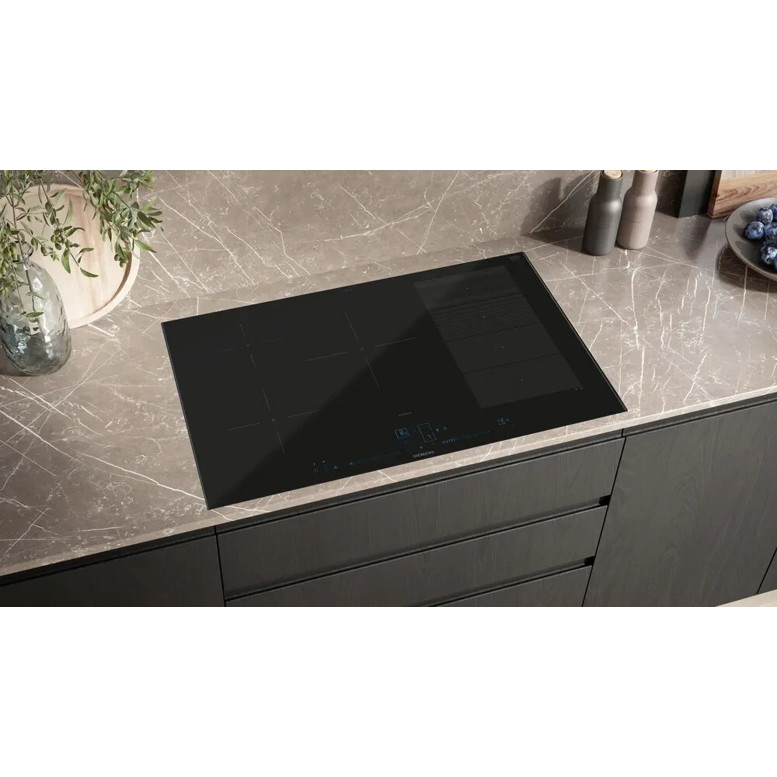 Das Siemens EX870NVV6E Induktionskochfeld der studioLine und iQ700 Serien bietet intuitive Bedienung durch Multi Slider und Touch-Control. Genießen Sie flexibles Kochen auf 5 Zonen mit Bratsensor und Topferkennung, ideal für moderne Küchen.