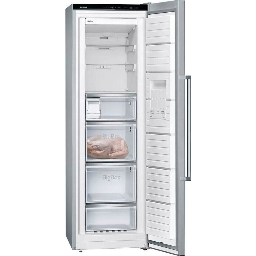 Der Siemens GS36NAIEP Gefrierschrank der iQ300 Serie bietet mit 242 Litern Fassungsvermögen und No-Frost-Technologie optimalen Komfort für große Haushalte. Mit seiner leisen Betriebsweise von nur 39 dB(A) und wechselbarem Türanschlag fügt er sich flexibel in jede Küche ein.